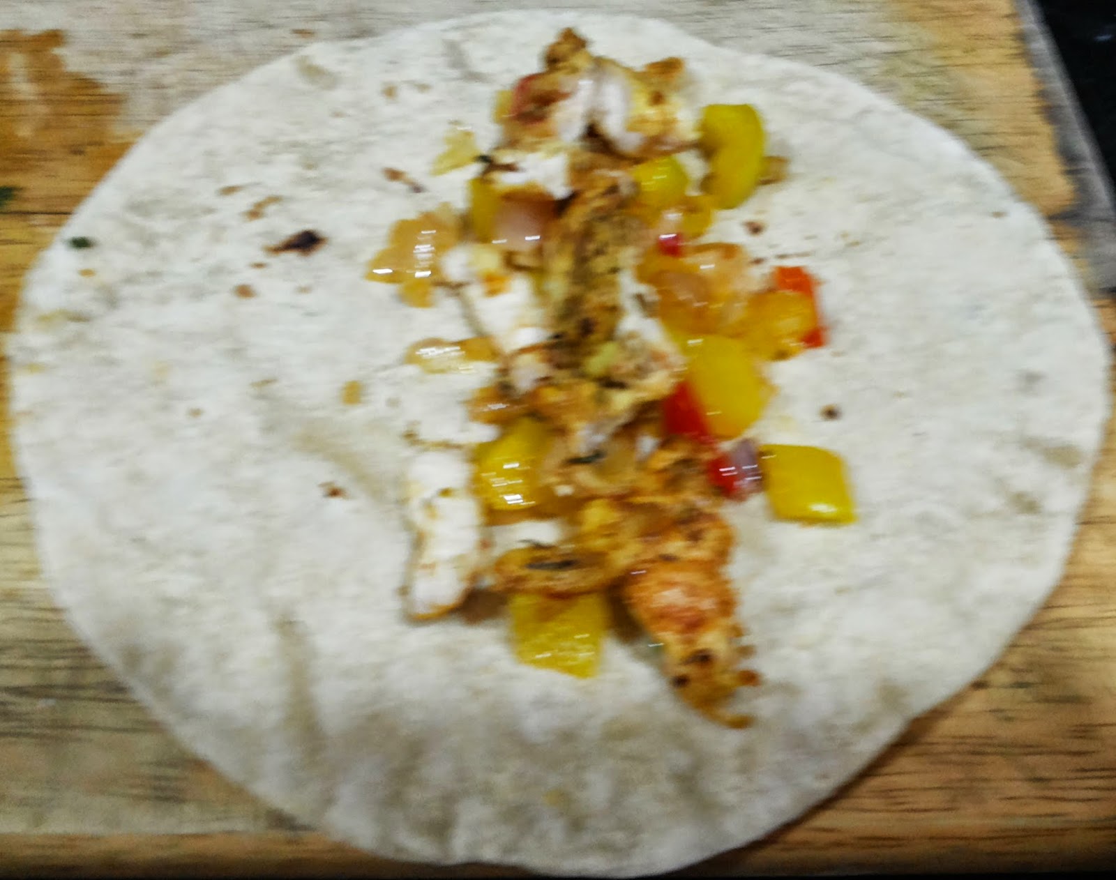 Spread the chicken, onion and peppers on the tortilla. Add salsa and